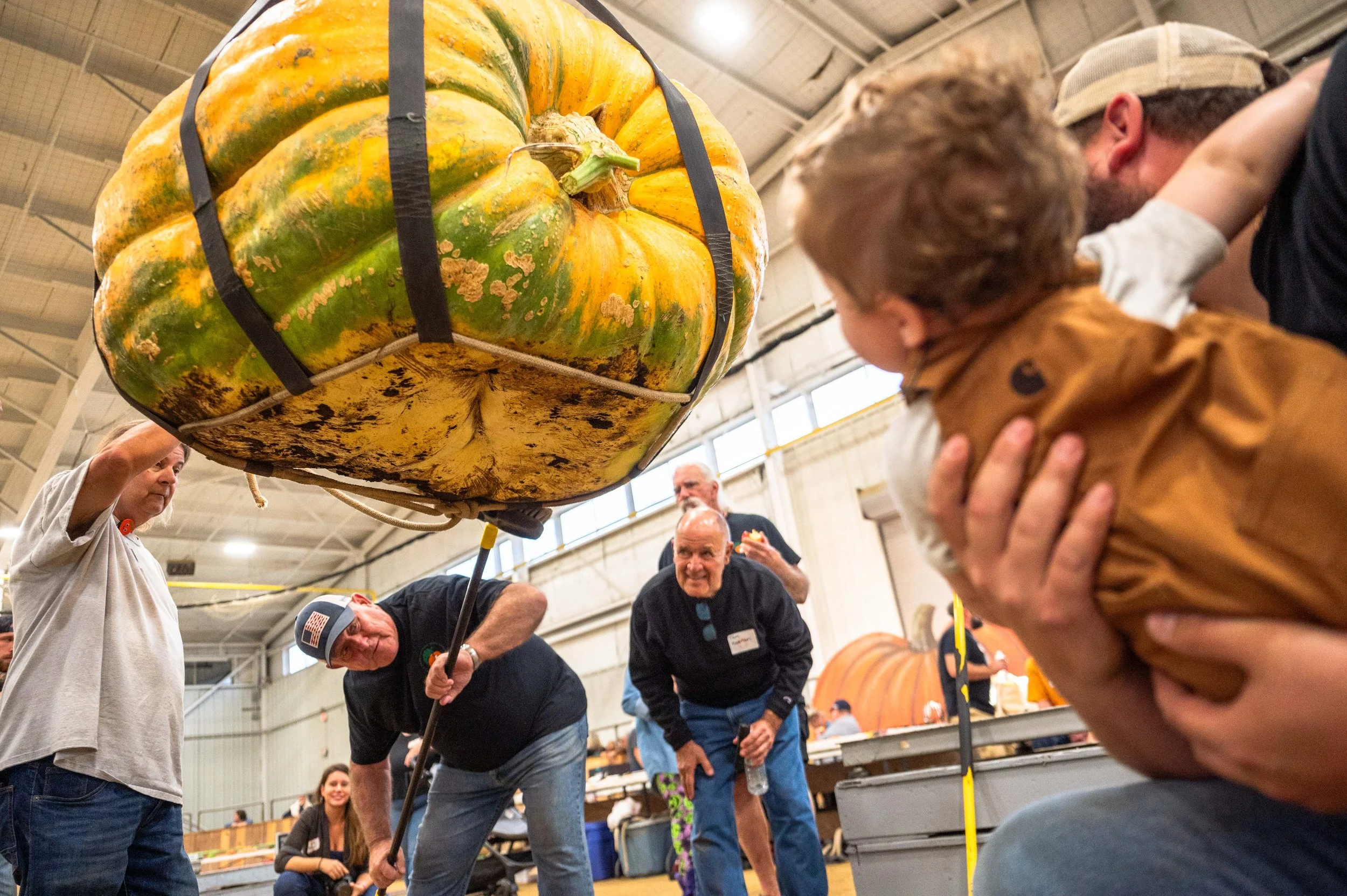 Judges clean and inspect the underside of a pumpkin for debris as Waylen Vasconcellos, 10 months old (right), watches at the giant pumpkin weigh-off at the Topsfield, MA fair on Friday, October 4, 2024.