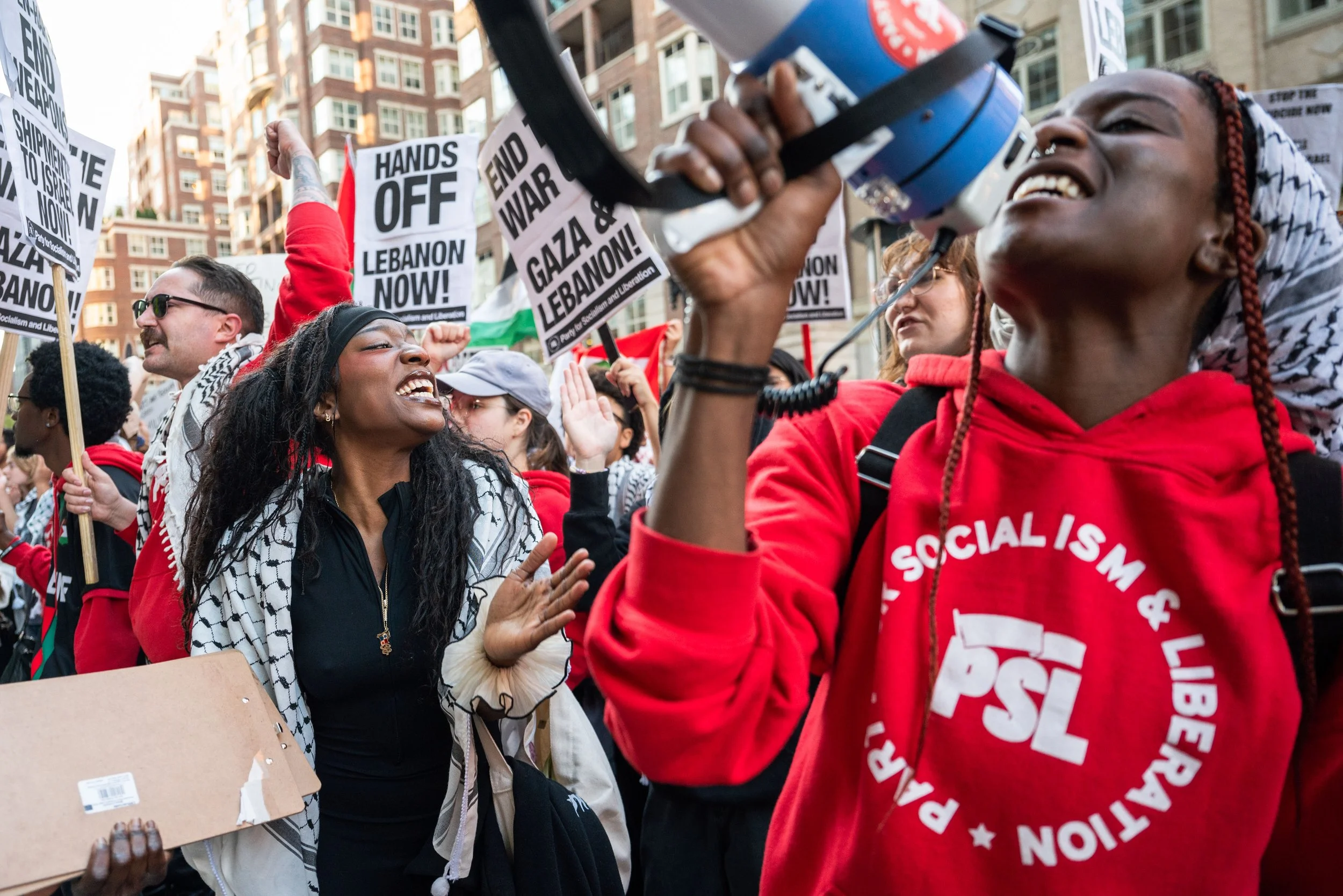 A biker wheelies through a steaming manhole in Washington, D.C. as a pro-Palestinian protest marches down a nearby street on Nov. 4, 2023.